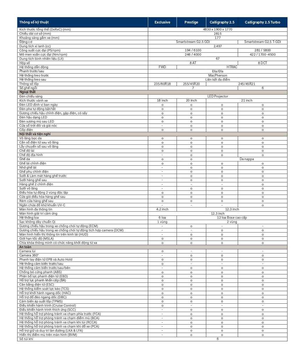 Bản Caligraphy Turbo đi kèm máy tăng áp 2.5 cho công suất 281 mã lực tại vòng tua máy 5.800 vòng/phút, mô-men xoắn cực đại 422 Nm tại 1.700 - 4.000 vòng/phút. Đi kèm là hộp số tự động ly hợp kép 8 cấp ướt (8DCT). Công suất của bản này lớn nhất phân khúc.