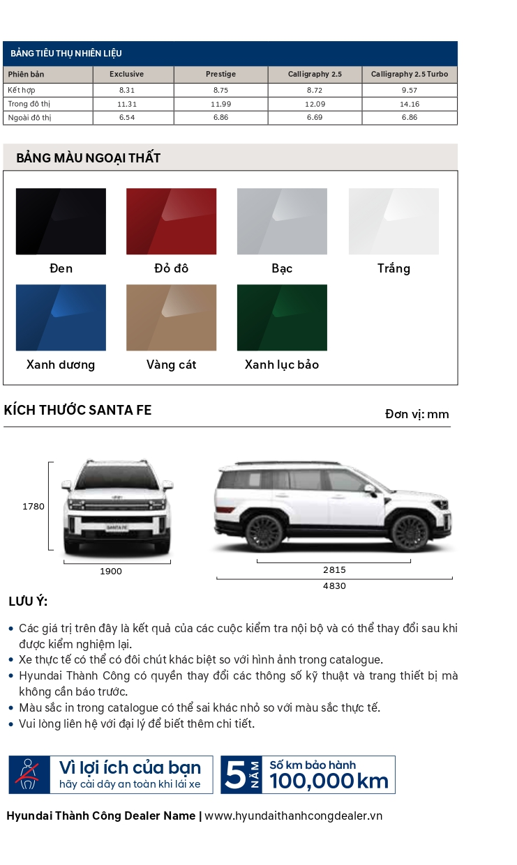 Santa Fe 2025 được bán ra với 5 phiên bản từ thấp đến cao, bao gồm: Exclusive, Prestige và 3 phiên bản Calligraphy (6 chỗ, 7 chỗ và Turbo). Xe tiếp tục được lắp ráp tại nhà máy của Hyundai Thành Công ở Ninh Bình, Việt Nam.